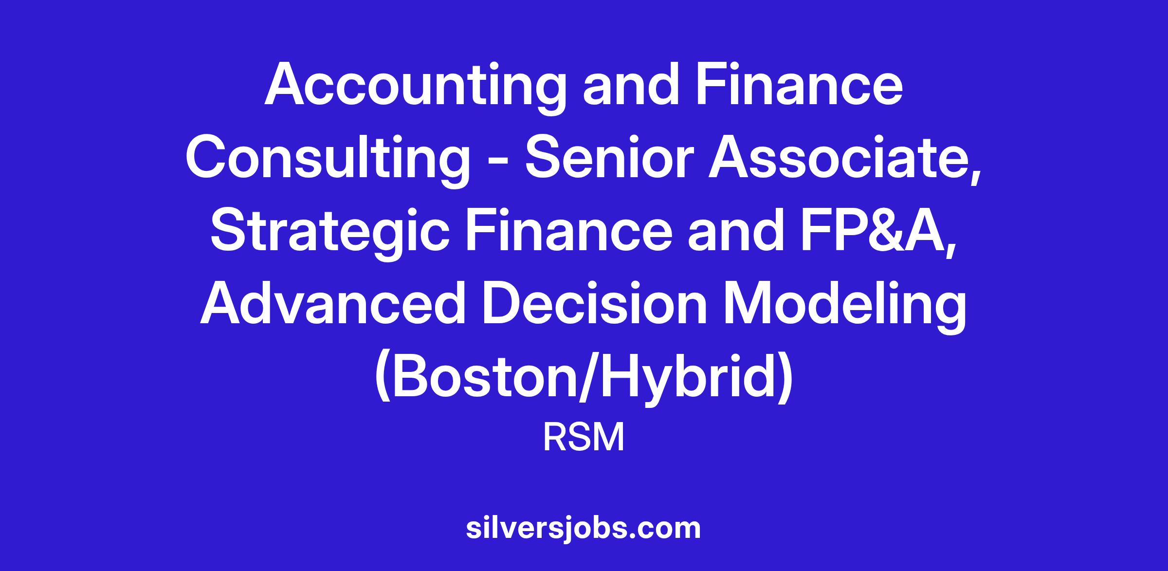 RSMUS is currently seeking a Senior Associate to join our Accounting and Finance Consulting practice within our Strategic Finance and FP&A solution set. We advise clients on strategic planning, financial planning and analysis (FP&A), budgeting, and capital structure optimization throughout various stages of a company’s life cycle via in-depth consulting and financial modeling.