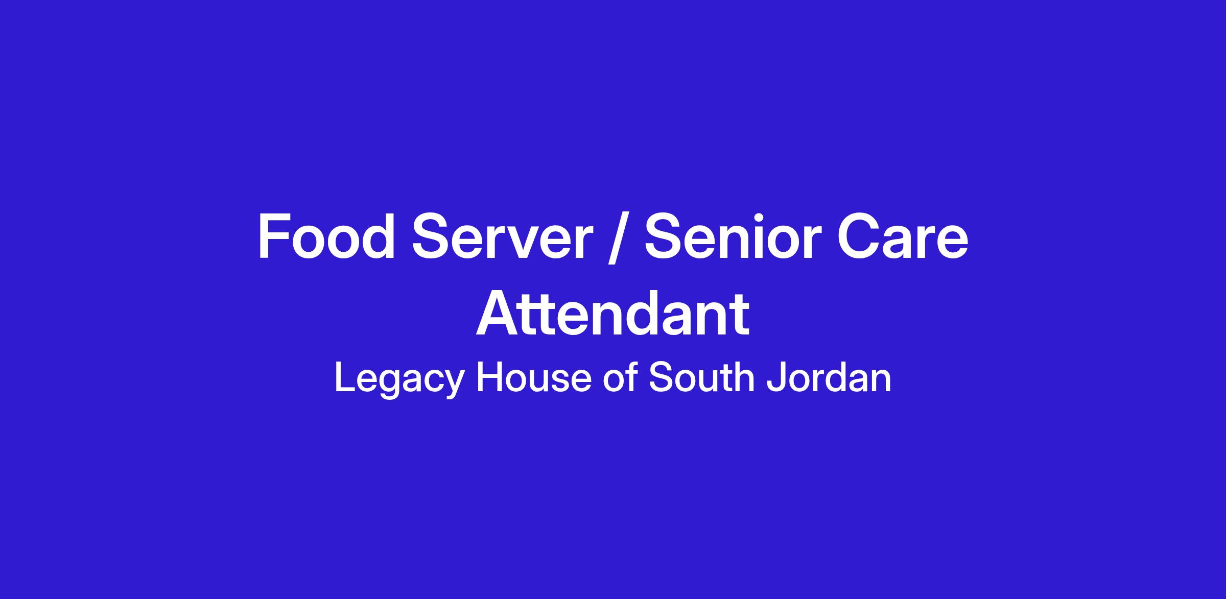 Legacy House of South Jordan is currently hiring for a full- or part-time Food Server / Senior Care Attendant to provide our residents with exceptional food service in Utah. This entry-level serving position earns a competitive wage of $14/hour, depending on experience.