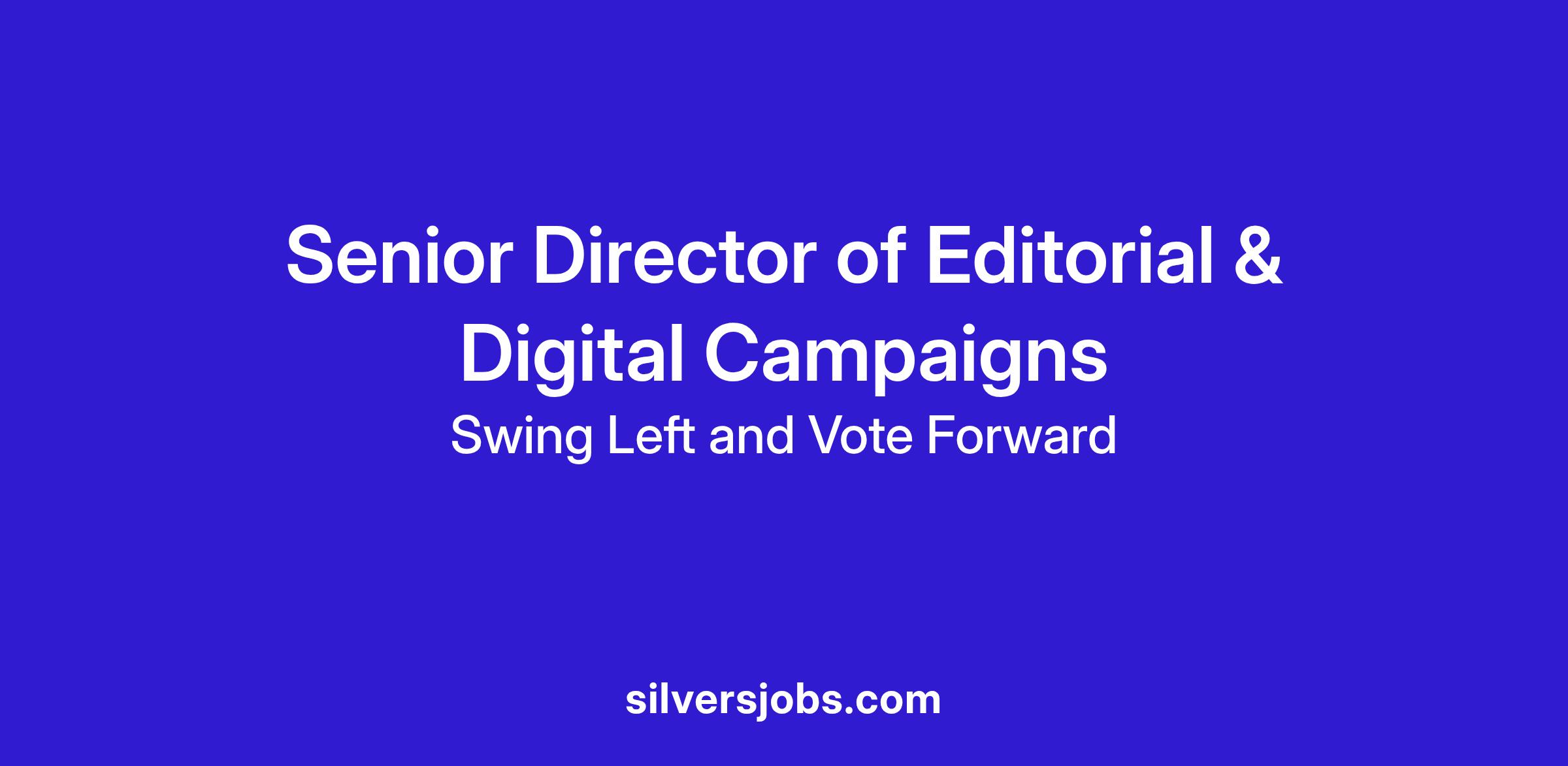 The Senior Director of Editorial & Digital Campaigns directs marketing campaign strategy across channels (primarily email, social, and web) and owns the organization’s editorial calendar—orchestrating launches, rapid-response campaigns, and ongoing content—ensuring campaigns drive meaningful and measurable results for audience engagement, grassroots fundraising, and volunteer mobilization. They serve as the lead for the email program, directing both strategy and execution.