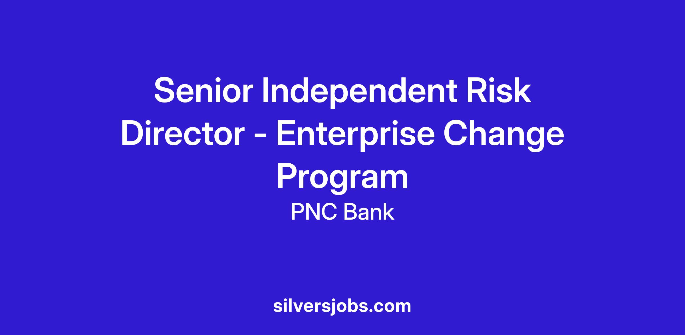 At PNC, our people are our greatest differentiator and competitive advantage in the markets we serve. We are all united in delivering the best experience for our customers. We work together each day to foster an inclusive workplace culture where all of our employees feel respected, valued and have an opportunity to contribute to the company’s success. As the Senior Independent Risk Director – Enterprise Change within PNC's Independent Risk organization, you will be based in a location within PNC's footprint. Responsibilities require time in the office or in the field on a regular basis.