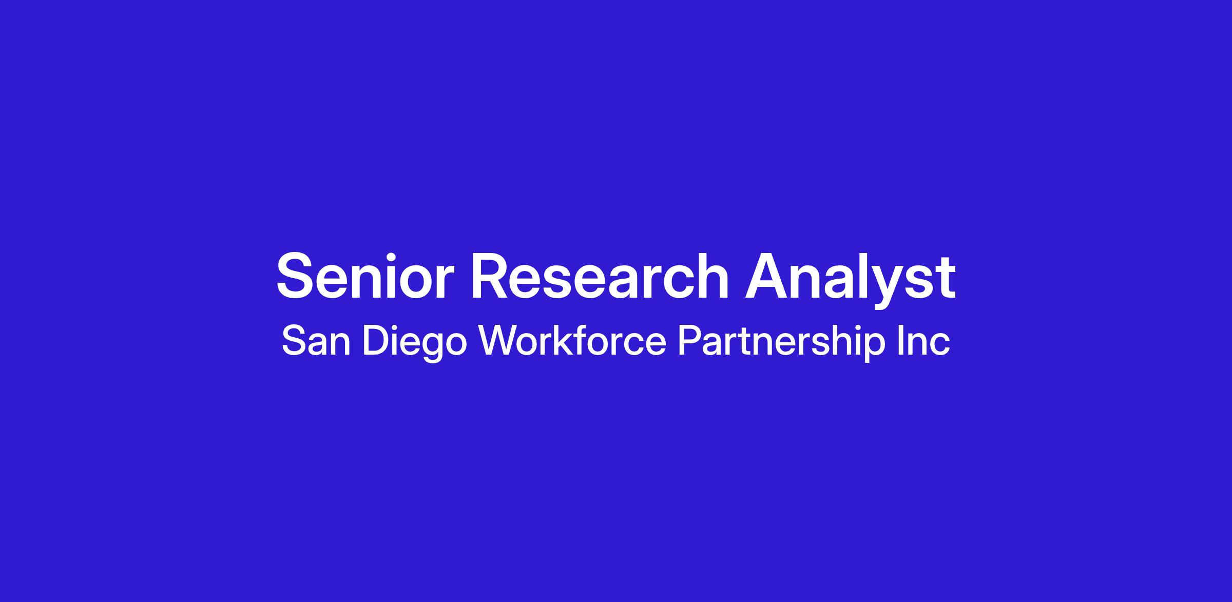 Reporting to the Vice President of Strategic & Policy Initiatives, the Senior Research Analyst is a hands-on technical expert responsible for translating labor market and program data into actionable strategy for workforce programs, policy development, and regional partners. This role serves as a foundational pillar for SDWP’s data-driven decision making producing high quality analysis, equity centered insights, and accessible data products that inform leadership, staff, the Workforce Development Board, and external stakeholders. The Senior Research Analyst will play a crucial role in driving insights into the industries and occupations driving San Diego’s economy, and sharing this information with job seekers, employers, educators and policy makers. In addition to analysis, the Senior Research Analyst will develop actionable data products dashboards, briefs, and reports that enable staff and partners to move from insight to action. The Senior Research Analyst will balance rigorous quantitative work with strong communication and applied problem-solving.