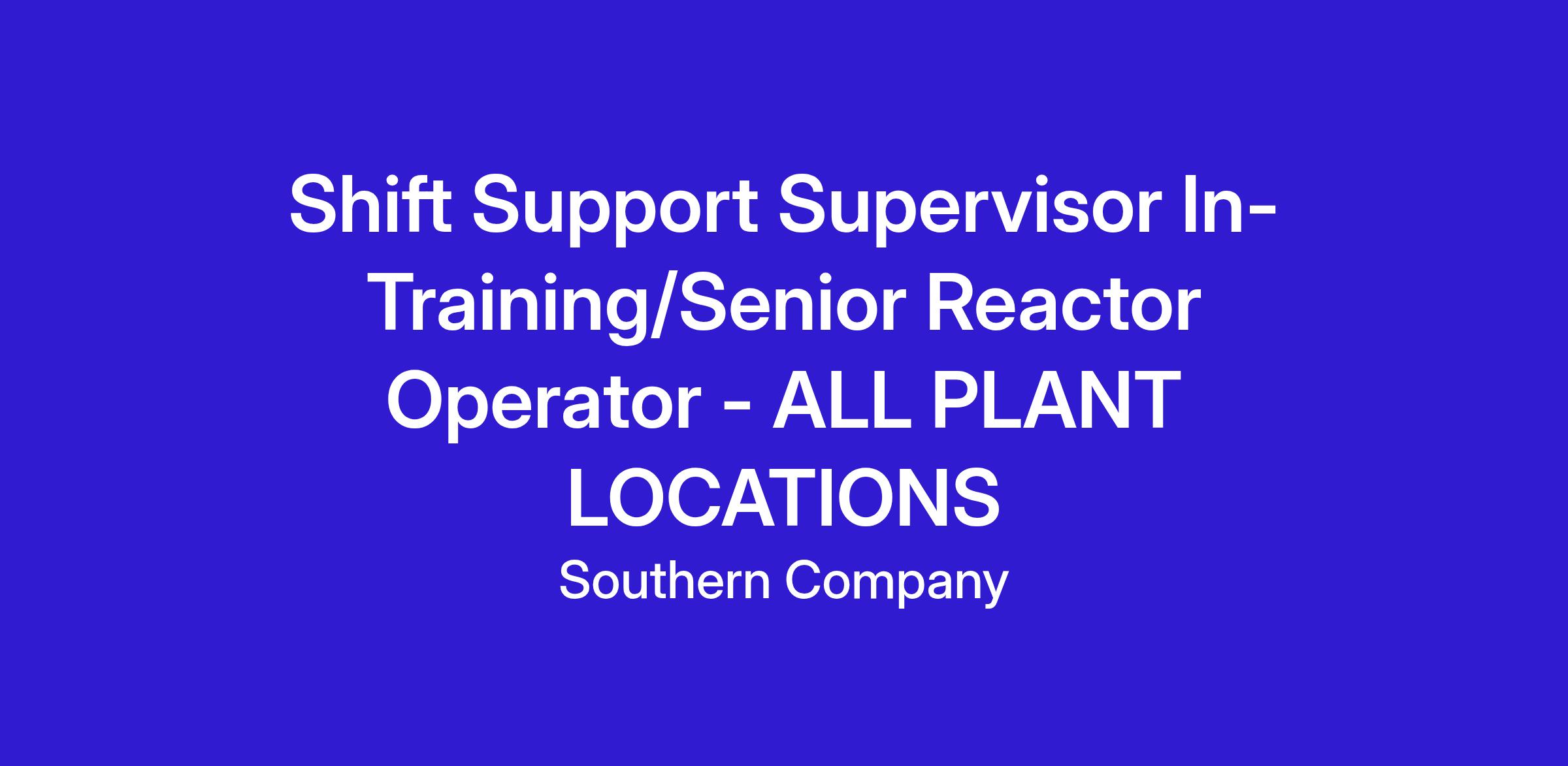 We will be hiring for Senior Reactor Operators (titled Shift Support Supervisors at SNC) over the next 18-24 months at each plant site, with a focus on Plant Hatch in Baxley, GA. Our in-depth screening and background process requires sufficient time for applicants to express interest and engage in our selection efforts in advance of the actual hire dates. Please note: when a SSS-IT class is scheduled to be filled, we will have a specific posting for the plant that will be hiring. You will need to apply to the site-specific posting. (If you are a current Southern Nuclear employee, please do not apply to this posting.)